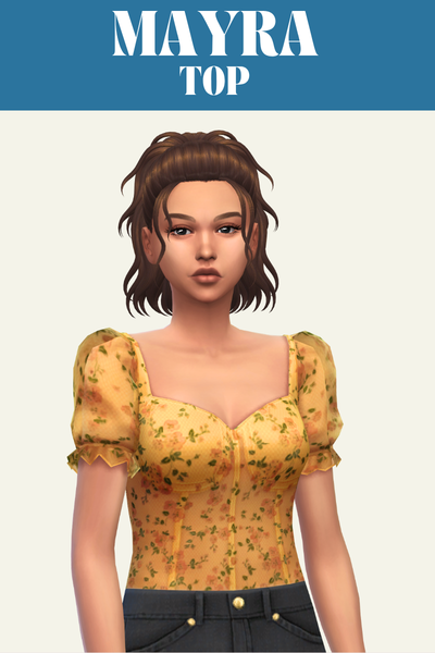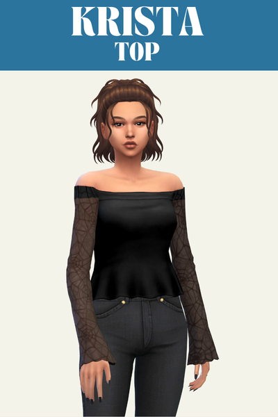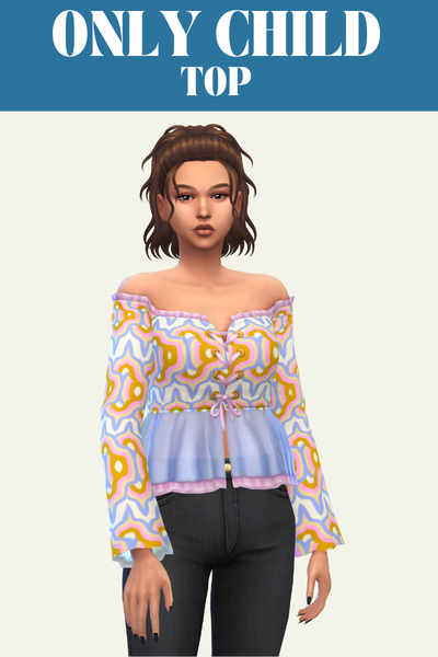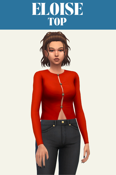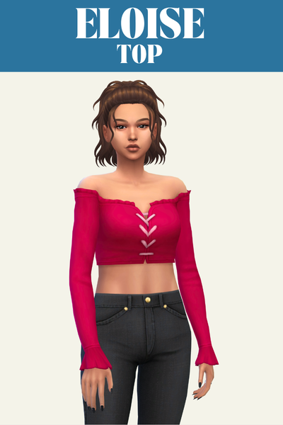 Eloise is a long sleeve off the shoulder peasant style type. This top looks so good with a high-waisted skirt and any hairstyle where the sim’s hair is behind their back.