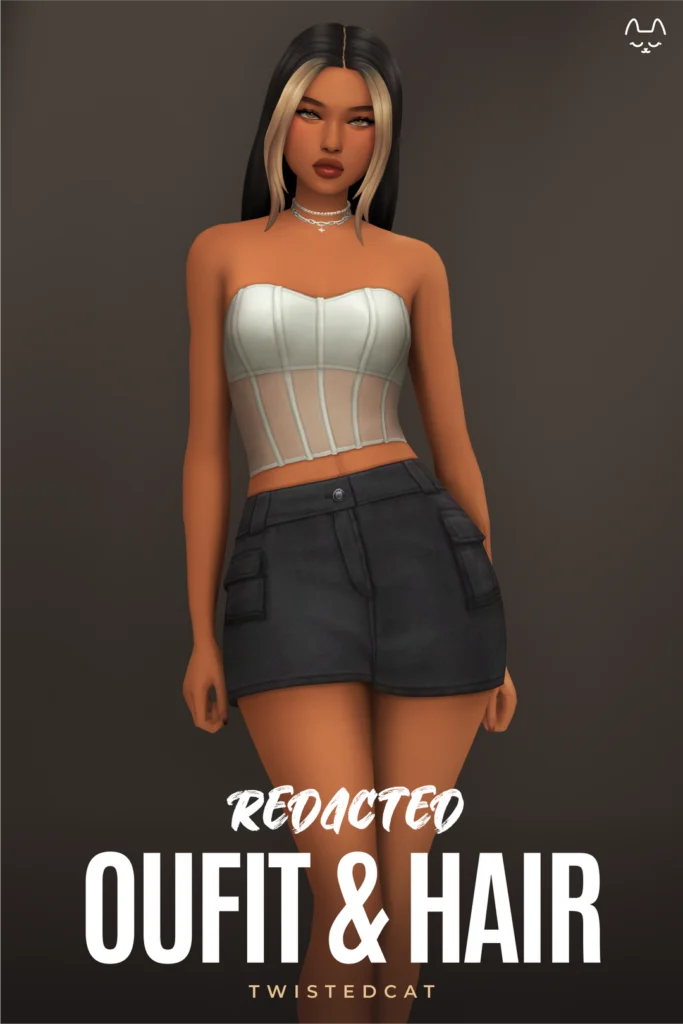 The redacted set has three items for you. You start with a middle-part hair that has two versions, one with a money piece. You also get a little corset top as well as a denim skirt.