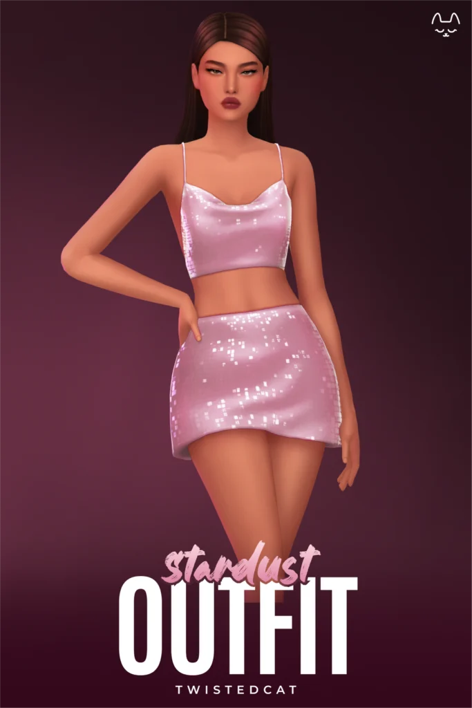If you’ve ever wanted to have your sim look like a disco ball, the Stardust Outfit is a great option. It has a little tank top with a cowl neck and a matching sparkly mini-skirt.