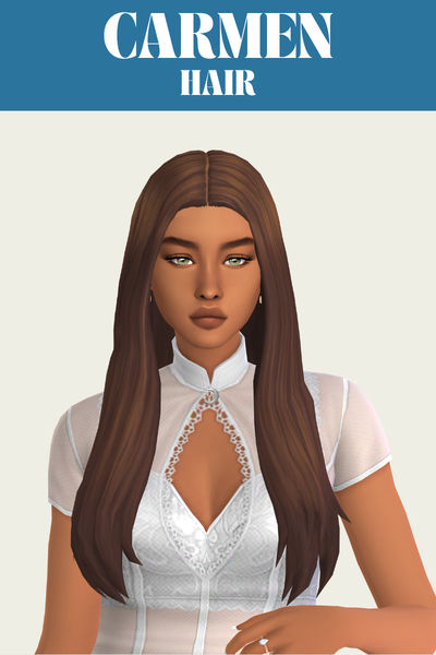 The Carmen hair is a middle-parted look that goes down past the bust in a really pretty way. It has no bangs or face framing pieces, just a gorgeous straight look like Regina George.