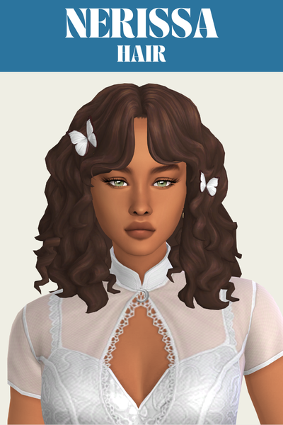 This hair is so much fun with a really pretty curly texture and some well styled front pieces. There are super cute butterflies you can add to the hair in any colour you could want to make a gorgeous look for your sim.