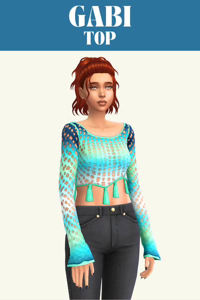 The Gabi top comes from a set all about the beach and summer. This top is a fun one with lots of holes all over and a set of tassels at the bottom that look super adorable.